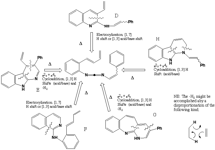 Various cycloaddition or electrocyclisation reactions are possible, followed by either acid/base catalysed [1,3] H shifts (these are not possible as pericyclic reactions) or just possibly [1,7] H sigmatropic shifts. The original literature citation is Tetrahedron, 1992, 48, 7425.