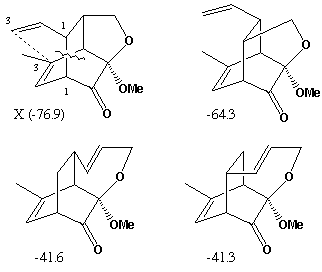 Molecular Modelling. Use of a modelling method such as PM3 (semi-empirical molecular orbital) allows relative energies for all the putative species involved to be calculated. That for compound C is calculated as -49.3 (kcal/mol), with the corresponding values for each possible intermediate and product being shown against the structure above. As can be seen, the most negative (most stable) corresponds to the intermediate X, whilst the most stable product is also the one actually formed. These relative energies are associated with the minimisation of bond angle and torsion strains in the cyclic systems. Models for all these species can be inspected here