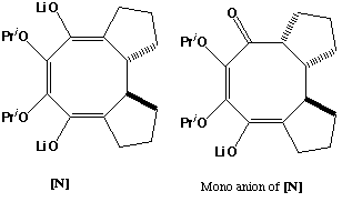 L might be expected to form with the two oxylithium centres anti, to minimise charge repulsion and to accommodate the lithium counterion solvated with THF. Electrocyclic ring opening (accelerated by the oxyanion characteristics) proceeds with conrotation (4n electrons, Mobius transition state) to give M, again with the two oxylithium centres presumed on the "outside" to minimise charge repulsion (torquoselectivity). Electrocyclic ring closure conrotation (4n electrons, Mobius transition state) proceeds with an antarafacial component to give predominantly trans stereochemistry at the newly formed C-C bond. Protonation of one enol centre gives the more stable cis 5-ring fusion. The final product is formed by a simple aldol condensation from N, again in a manner which gives a cis ring fusion. Molecular modelling reveals this stereoisomer to be significantly more stable than the trans fused form. Interestingly, the mono-anion of N can exist in two conformations, with the carbonyl group oriented either syn or anti to the adjacent fused 5-ring. The syn ("up") form is the one that leads to the final observed stereochemistry of the resulting alcohol, although it is actually slightly less stable than the anti isomer. This suggests that aldol formation is a reversible process driven by the thermodynamic stability of the final product.