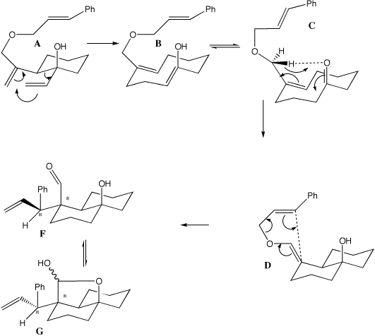 A to B is a typical [3,3] sigmatropic rearrangement (two double bonds separated by three s bonds) and is a 4n+2 thermal process proceeding via a Huckel transition state with suprafacial stereochemistry. The enol so formed rapidly tautomerises to the ketone C, which then undergoes an ene reaction (two s bonds formed, one broken) to form D, also a 4n+2 Huckel reaction. Either one of the two hydrogen atoms on the prochiral CH2 group (differentiated as Pro-R and Pro-S) can be transferred resulting in E or Z double bond isomers, via a transition state the more stable of which leads to D and the less stable to E. D/E again have the pattern of two double bonds separated by three sigma bonds, which allows another [3,3] sigmatropic reaction to occur, via a chair 4n+2 Huckel transition state in which the new C-C bond is formed suprafacially to create two new chiral centres in F/H (see models). This rapidly and non-stereospecifically cyclises to the final product G. The other double bond isomer E which [3,3] cyclises via another chair transition state to H does so with the opposite configuration at the benzylic carbon (see the 3D models to really convince yourself this is true). For more details, see L. Barriault and I. Denissova, Organic. Letters, 2002, 4(8), 1371-1374. 3D models for these transition states can be viewed at http://www.ch.ic.ac.uk/local/organic/tutorial/rzepa6/.