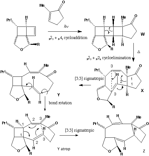 - Two successive electrocyclic reactions, the first 4n via Mobius to give the trans dimethyl stereochemistry, the second 4n+2 via Huckel to give the cis-ring fused system. Then 4n+2 Huckel cycloaddition (two possible stereoisomers, but one is more sterically hindered than the other) followed by cycloelimination of a cyclobutene, which then opens in a 4n Mobius electrocyclic reaction to give the trans hexadiene. This problem becomes more tractable if the starting material is redrawn into a cyclisable form by rotating about formally single bonds, hence the hint!