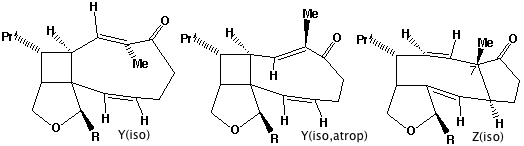 - Compound X has the characteristic 3-single/two-double bond pattern associated with the [3,3] sigmatropic Cope rearrangement. This is actually possible in two directions, but we concentrate on the one that creates an sp2 centre at C-8, the atom at which inversion of configuration is observed to occur. This produces a flexible 9-membered ring, which can flip the trans alkene bond by atropisomerism (rotation) about the adjacent single bonds, to produce a conformer with the C-8 hydrogen pointing up. Reverting the [3,3] sigmatropic reaction using this conformation will now reform the 5-8-5 ring system but with the correct stereochemistry at C-8.